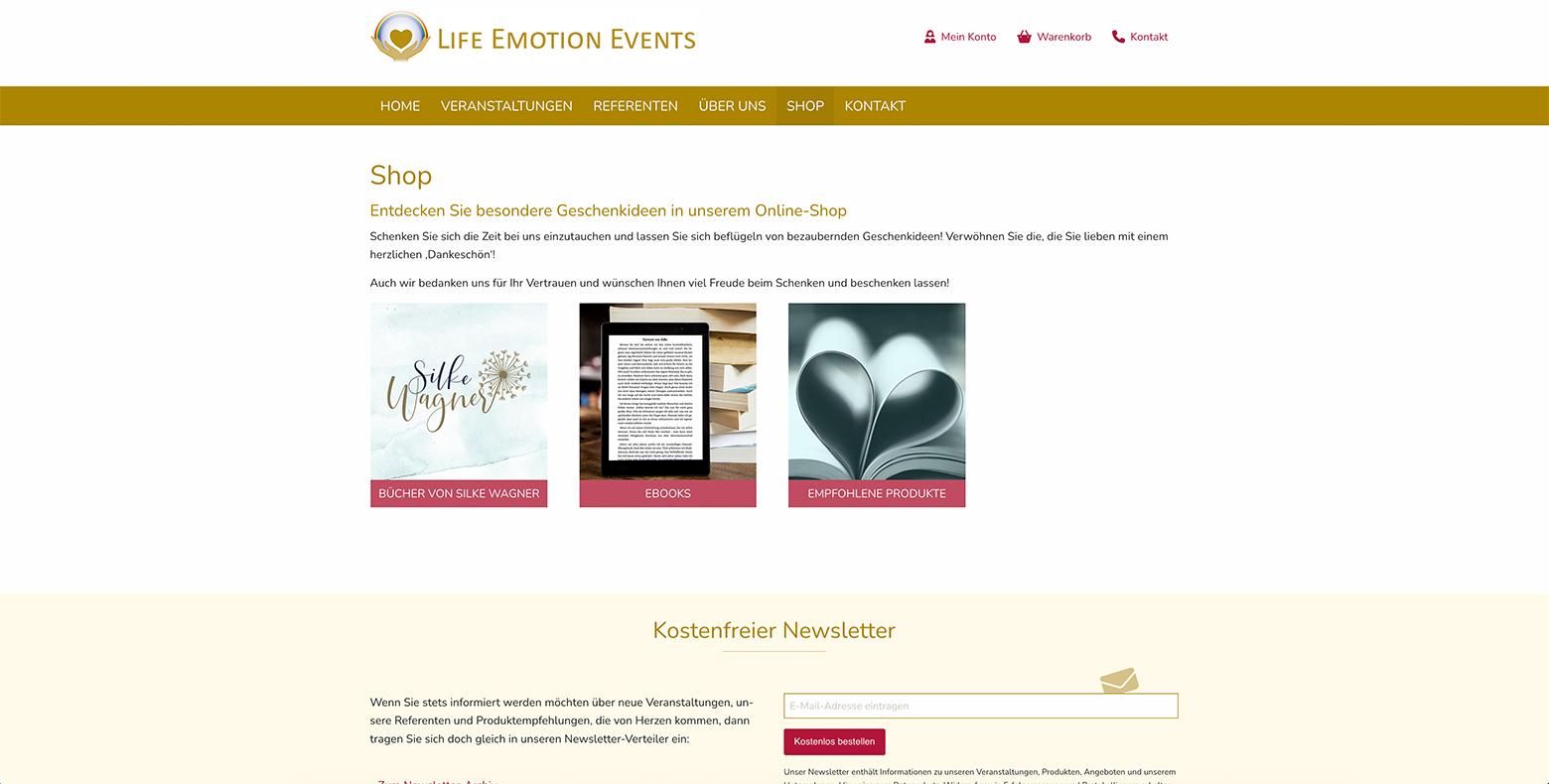 In der Gestaltung liegt der Fokus auf großen, einladenden Elementen und emotionaler Ansprache: Bilder und Headlines wecken Interesse und tragen die Themen von Life Emotion Events sichtbar nach außen.